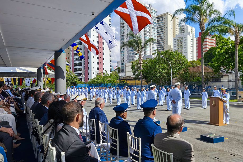 Em discurso, o Vice-Almirante Linhares celebrou as etapas de sua carreira e expressou gratidão a diversas pessoas, instituições e embarcações que fizeram parte de sua história.