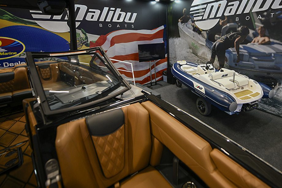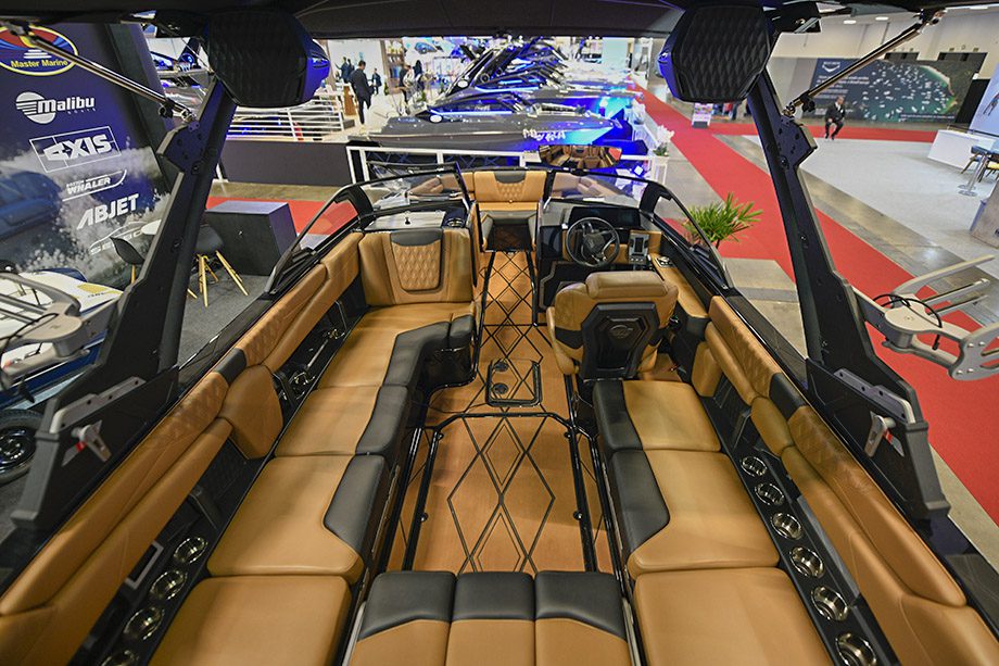O grande destaque é a M230, da Malibu Boats, fabricada no Tennessee, nos EUA. Com 23 pés de comprimento, a lancha reúne atributos capazes de gerar ondas em diferentes formatos — e ainda oferece espaço para até 15 pessoas acompanharem o esporte a bordo, além do piloto.