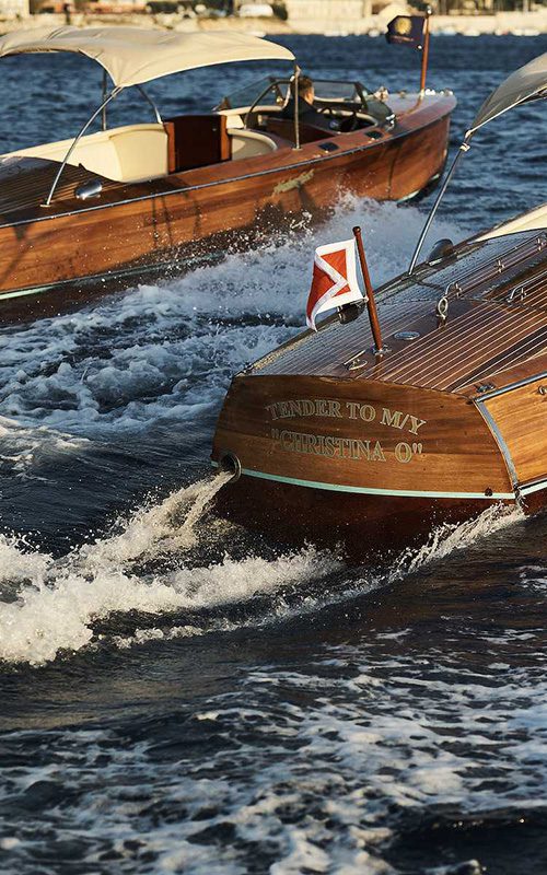 Na lista de embarcações auxiliares e brinquedos aquáticos, há dois barcos de madeira Hacker Craft projetados especialmente para o Christina O e feitos à mão, três jets Sea-Doo modelo 2023, 14 embarcações salva-vidas para até 380 pessoas (no total), um bote inflável rígido Olympic Cruiser e um barco Medline de 27 pés (8,3 metros) de comprimento.