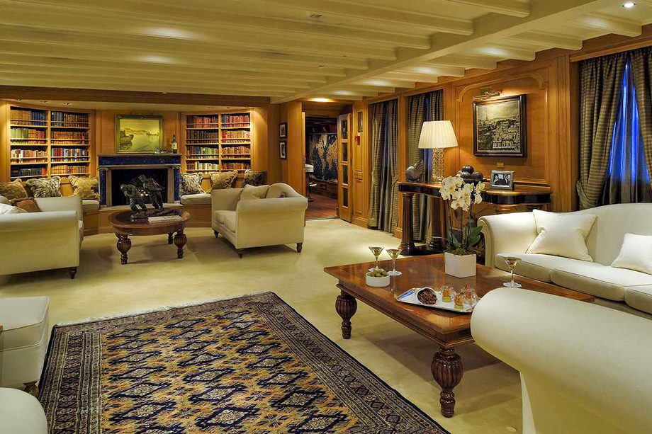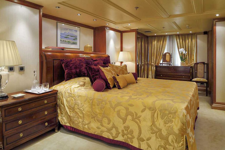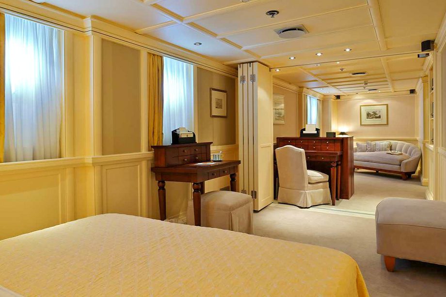 A cabine do proprietário completa o leque de acomodações em grande estilo. Chamada de Suíte Onassis, o espaço conta com quarto, banheiro, biblioteca e sala de estar próprios — praticamente um flat privativo.