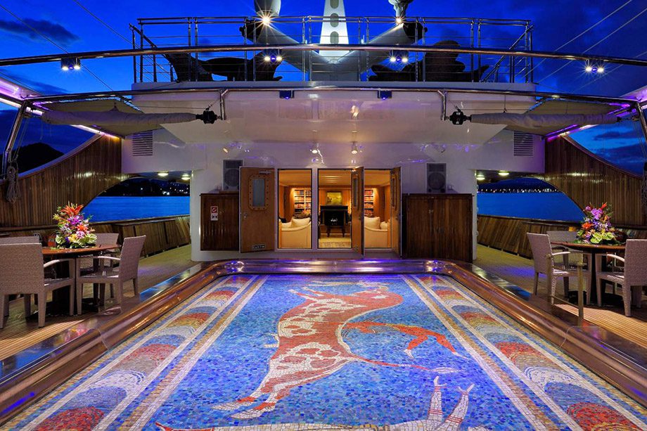 No topo da lista de popularidade certamente está a piscina feita em mosaico de arte minoica, onde os tons de azul, magenta e bege prevalecem — ou seja, aquilo que já agradaria com um simples fundo clean virou mais um espaço para apreciação a bordo.