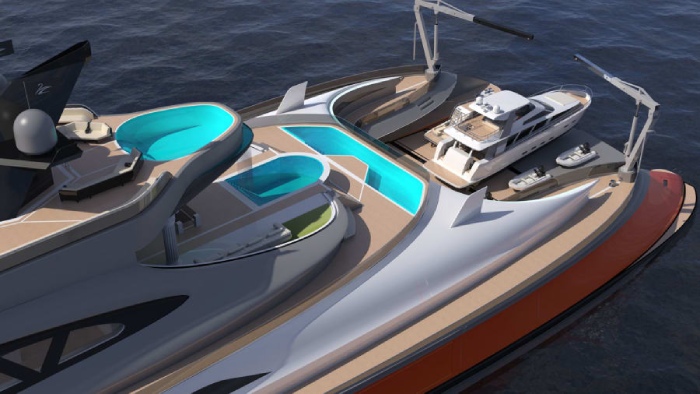 O modelo de luxo poderá acomodar cerca de 40 convidados ao mesmo tempo e, com duas garagens cheias de brinquedos aquáticos a bordo, haverá muito para mantê-los entretidos. Todas as suítes ficarão localizadas na parte inferior do casco, juntamente com uma academia e pelo menos uma piscina fechada.
