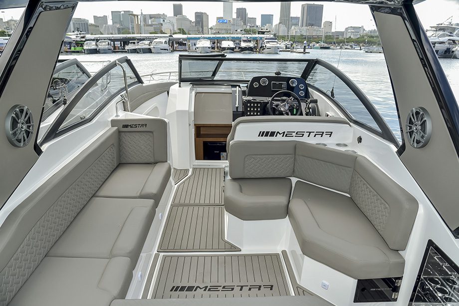 A circulação também é destaque, com passagens largas, altas e seguras, pensadas para facilitar o deslocamento a bordo. Outro diferencial da Mestra 282 está em um recorte lateral no casco, que permite aos passageiros acompanhar a água durante a navegação, proporcionando uma experiência mais imersiva. Para o presidente da marca, trata-se de um “recurso inédito no mercado brasileiro.”