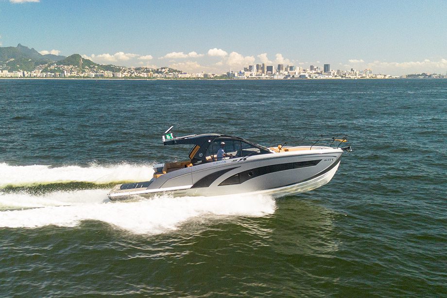 No convés, o projeto prioriza a convivência, com hard top, áreas integradas, espaço gourmet e plataformas laterais rebatíveis, que ampliam a área útil junto ao mar e facilitam o acesso para banhos e lazer. A lancha é homologada para até 14 pessoas e traz a opção da motorização de popa, a preferida do público dos EUA.