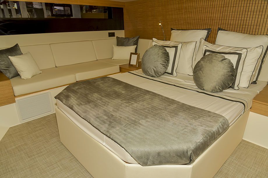 Se tratando do modelo de 50 pés, destaque da marca no evento, a performance também é digna de atenção. Conforme detalhou Trindade, a embarcação alcança até 45 nós (cerca de 83 km/h). “É um barco superinteressante, com um volume enorme e muito espaço habitável.”