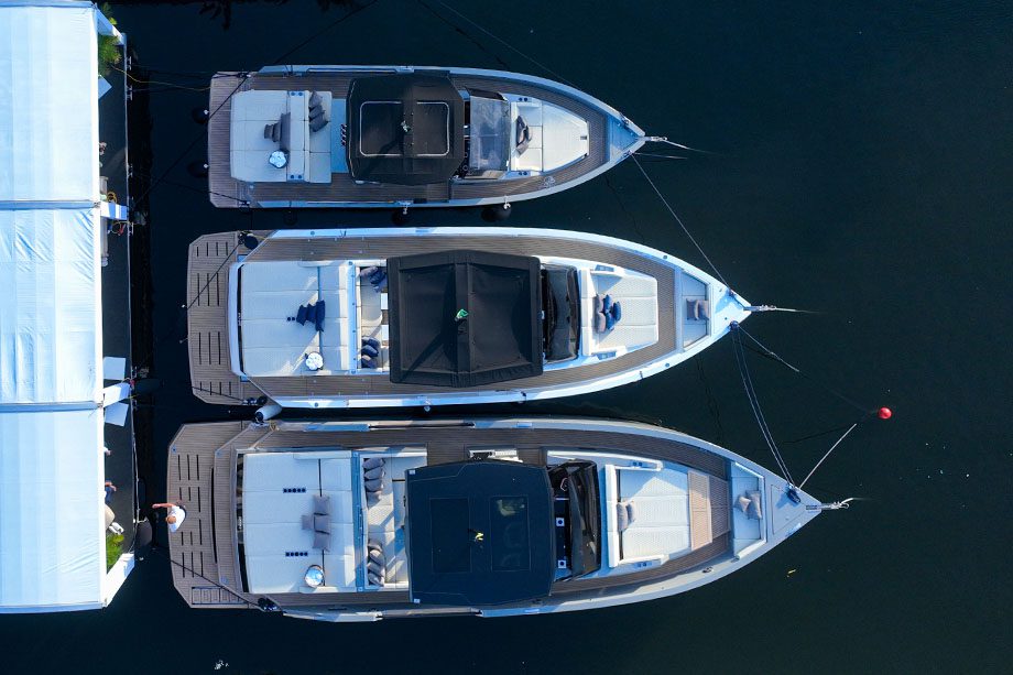 A empresa apresenta três embarcações na 27ª edição do salão náutico carioca: D32, D42 e D50 — esse último, o grande destaque. No conjunto, uma característica em comum chama atenção: os motores de popa estão ali, mas passam completamente despercebidos.