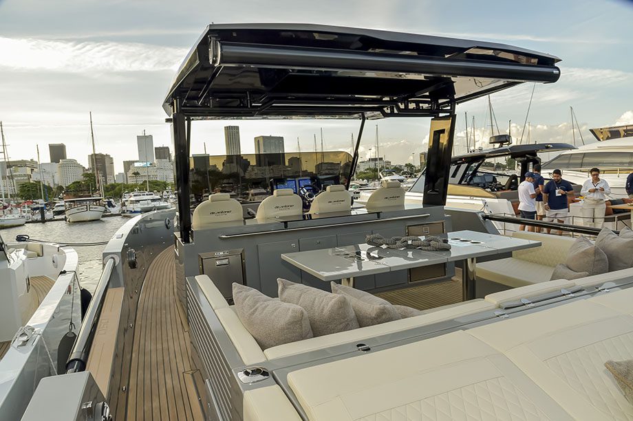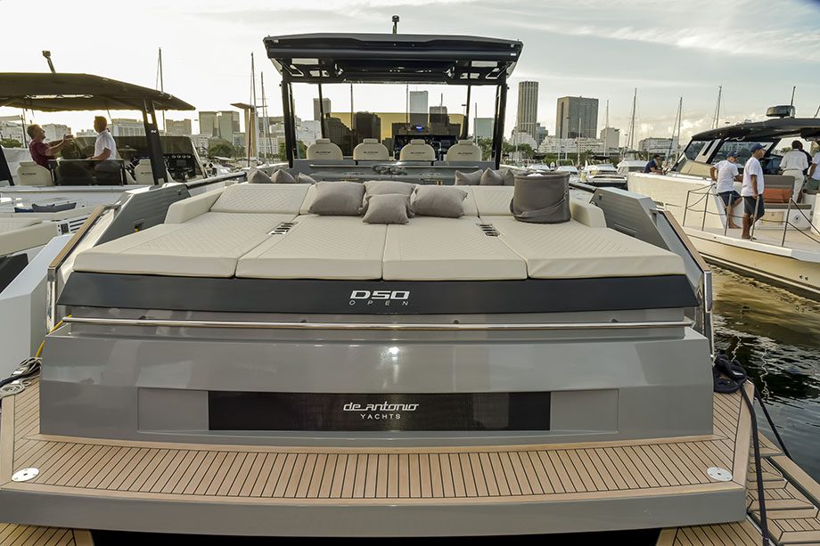 Versátil, o D50 Open permite diversas configurações, com opções de dois ou três camarotes, um ou dois banheiros e diferentes arranjos de motorização — que pode variar de dois a quatro motores de popa. Além disso, o barco se destaca pelo equilíbrio entre desempenho e habitabilidade, oferecendo amplos espaços internos e externos aliados a uma navegação eficiente. São 12,65 metros de comprimento e capacidade para até 12 pessoas.
