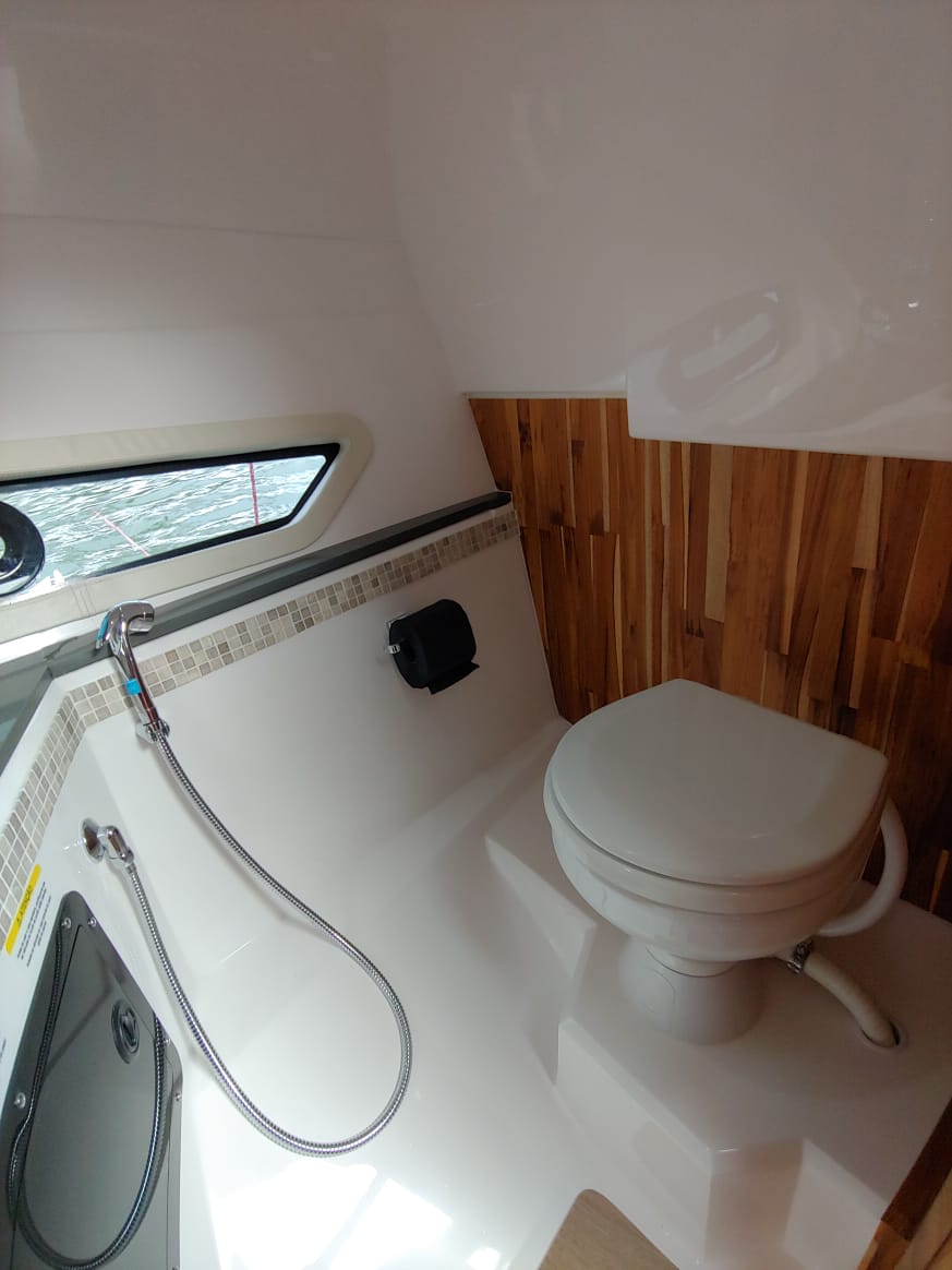 O cockpit amplo e sem degrau de entrada traz layout tradicional com sofás em L, mesa rebatível em teca, vasto espaço de armazenamento, porta-copos e posto de comando com banco duplo para piloto e copiloto. Tudo protegido por um hardtop em fibra, que compõe o design do barco.