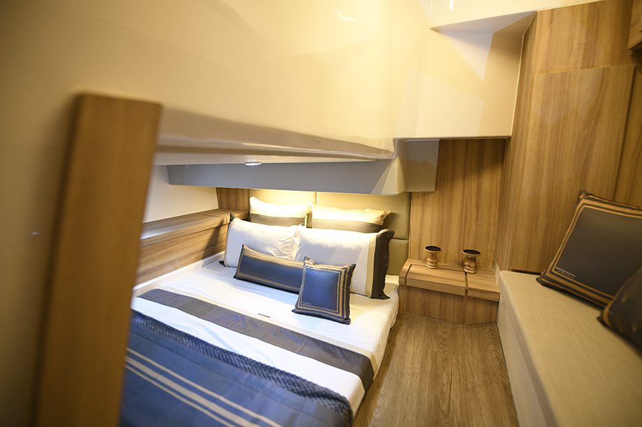 O acesso à proa é feito por passagens laterais tanto à bombordo quanto à boreste. Já no interior, são duas cabines fechadas — a principal delas à meia-nau — de até 1,95 metro de altura e um banheiro com box.