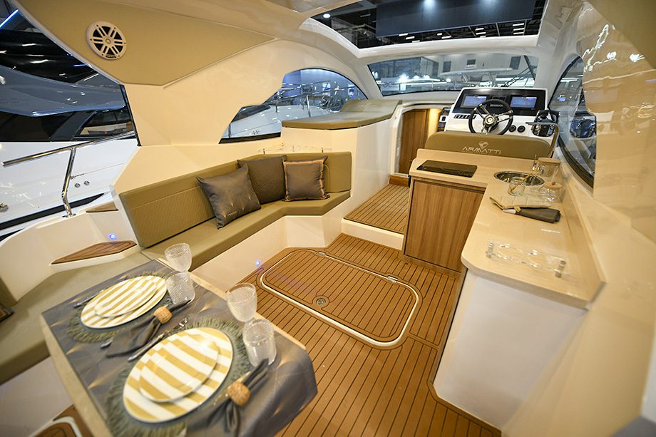 Na popa, uma plataforma submergível com degraus integrados promete facilitar tanto o embarque quanto o desembarque. Ainda por ali, quem estiver a bordo pode aproveitar o espaço com a comodidade de um móvel gourmet.