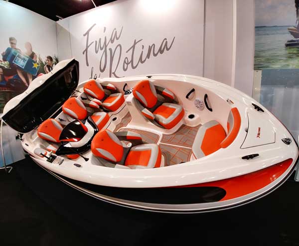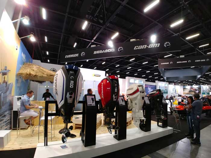 No estande da BRP no São Paulo Boat Show, além dos motores Evinrude da geração II, de 300 e 150 hp, ambos já vendidos na rede de concessionários da marca, o destaque ficou para o novo propulsor hidrojato de 250 hp que equipa um jetboat nacional (desenvolvido pela Colunna), lançado no salão e que, completo para navegar, foi vendido por R$ 149 mil.