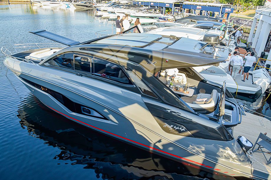 Outro barco da NX que promete atrair olhares na Bahia Marina é a NX 44 by Pininfarina — também já testada por NÁUTICA. A lancha de 13,77 metros possui uma conexão contínua entre espaços internos e externos, acomoda até 20 passageiros — com pernoite para quatro — e, entre outros destaques, carrega uma área gourmet completa e solário na proa, numa mistura de design e funcionalidade.