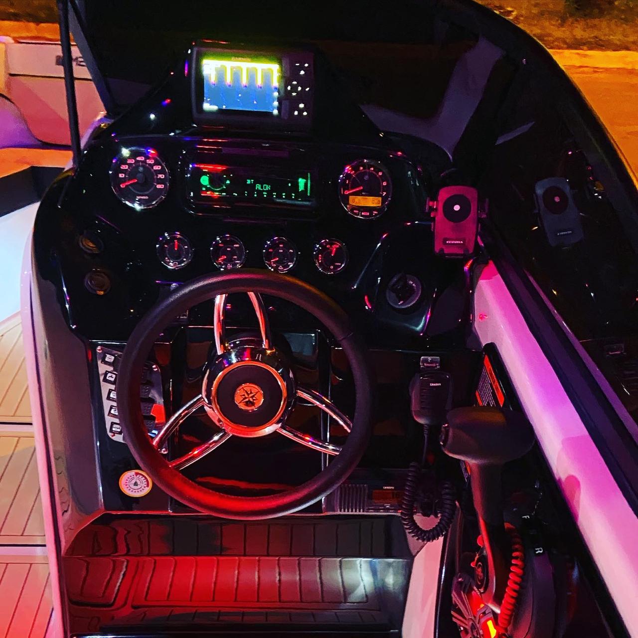 A lancha também tem banheiro completo a boreste (com vaso, pia, lixeira, vigia para ventilação e iluminação natural ou por luz de led), e camarote a bombordo (com cama de quase 1,70 metro, além de controle para o som, janela para iluminação, vigia para ventilação, luz de led e porta-objetos).