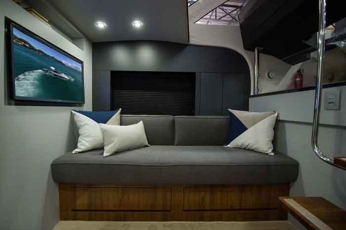 Uma porta de correr de três folhas leva ao salão principal, que vem com a cozinha já em primeiro plano, seguida da área de estar equipada com sofás e mesa dobrável além do posto de comando com joystick. As amplas janelas favorecem a entrada de luz natural no ambiente. Ao descer para o convés inferior, encontra-se a suíte principal à meia-nau com banheiro com box fechado, suíte de casal à proa com banheiro reversível com box e camarote duplo a boreste. Esta lancha pode receber motorização IPS 800 ou IPS 950.