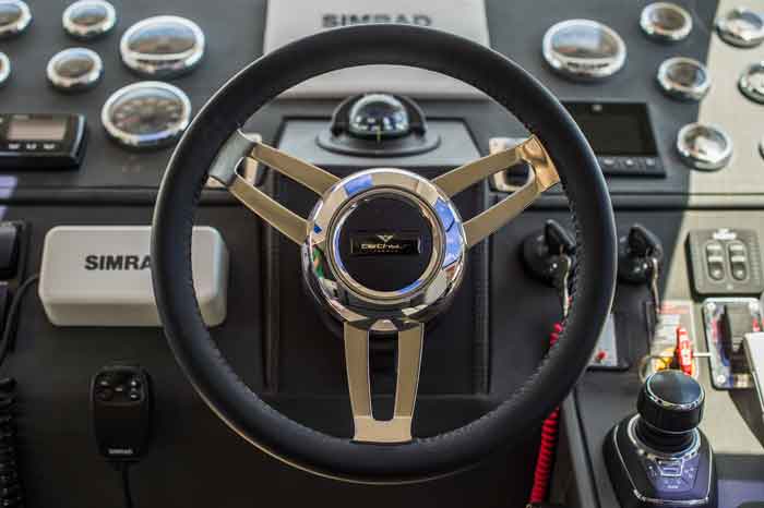 Primeiro barco de lazer do mundo comandado exclusivamente por meio de um joystick Volvo Penta, e não pelo tradicional timão, que continua equipando o comando do flybridge, esta embarcação também conta com plataforma lateral integrada e no mesmo nível da praça de popa, aumentando a área útil da lancha.