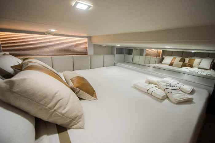 Além disso, o interior desta embarcação é bem espaçoso e tem seus ambientes interligados. De lá, é possível acessar tanto a parte inferior do navio quanto a superior. Na inferior estão os camarotes e o cliente pode escolher dois layouts diferentes: um com três camarotes, com a do proprietário ocupando todo o casco de estibordo e outro para uso fretado, com quatro camarotes.
