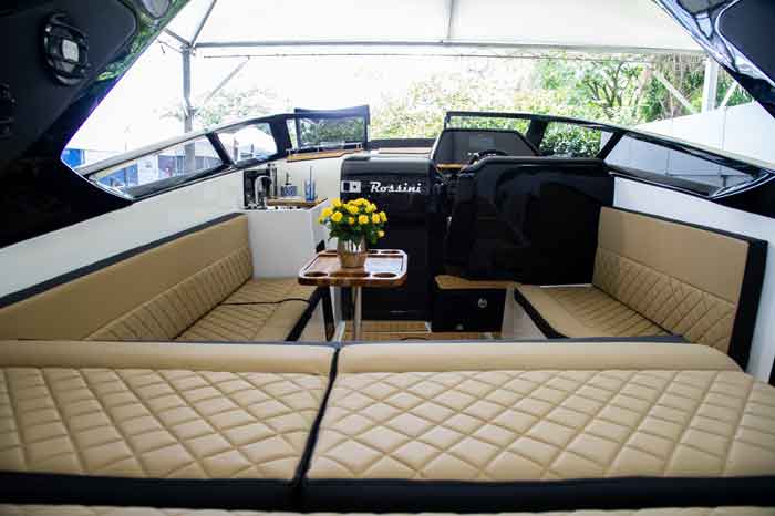 Seu layout de três camarotes, que foi customizado, inclui uma suíte master e dois camarotes de hóspedes dentro dos cascos. A cozinha, a despensa e as acomodações da tripulação são acessadas diretamente da cabine de popa. O salão do convés principal compreende uma grande mesa de jantar que pode acomodar 12 pessoas. Um bar molhado é encontrado na entrada do terraço da proa.