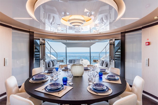 Com mais de 22,5 metros de comprimento, o modelo, amplamente equipado e mobiliado, conta com 3 pavimentos, 4 suítes e uma área total aproximada de 225 m². Em outro espaço reservado, a tripulação conta com duas cabines, um banheiro e uma lavanderia.