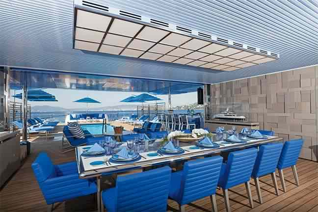 O modelo conta, ainda, com academia, jacuzzi 3 muitos outros itens de conforto, relaxamento e luxo. Pode ser equipado com dois motores Caterpillar de 1380 kW cada.