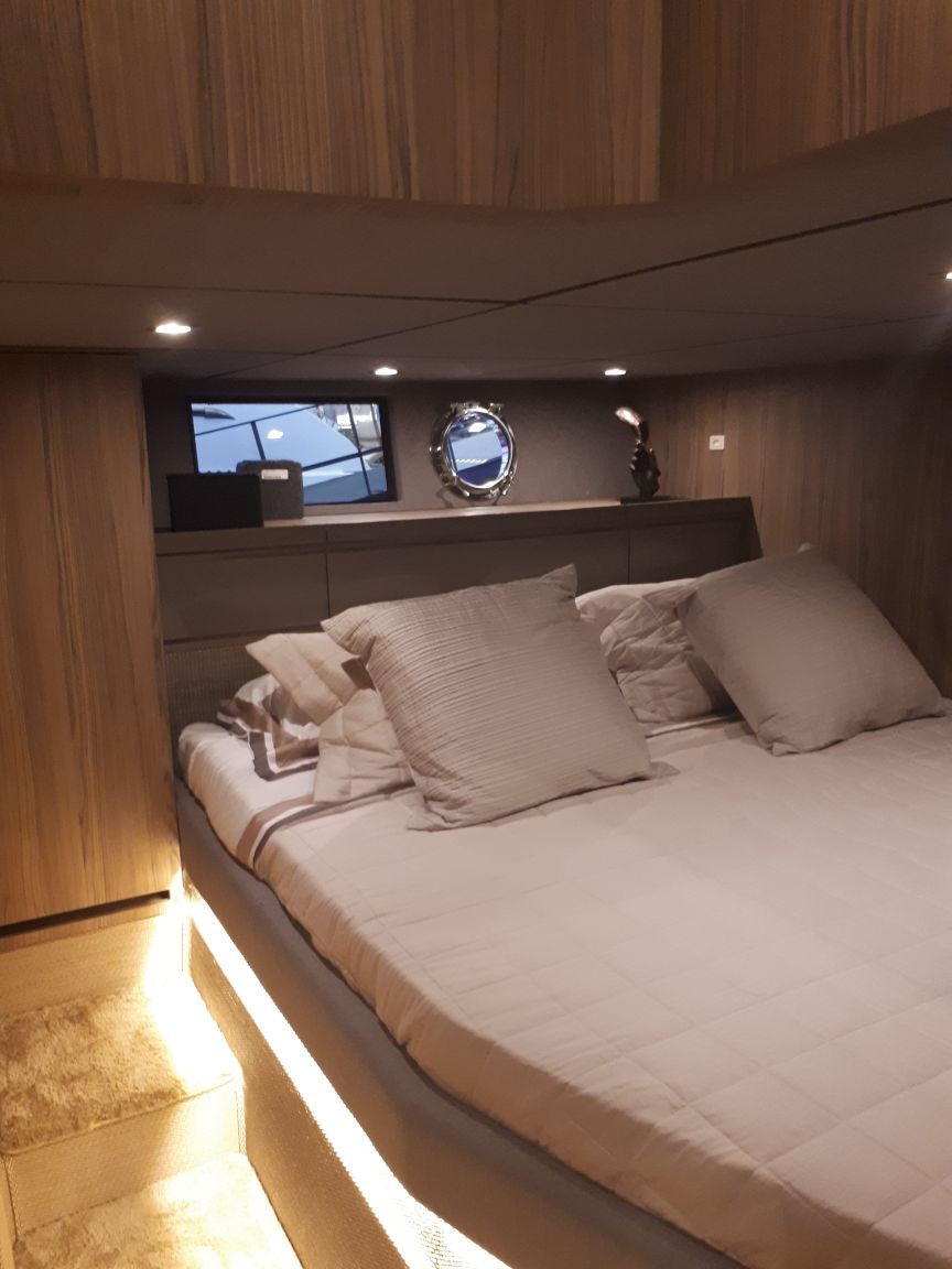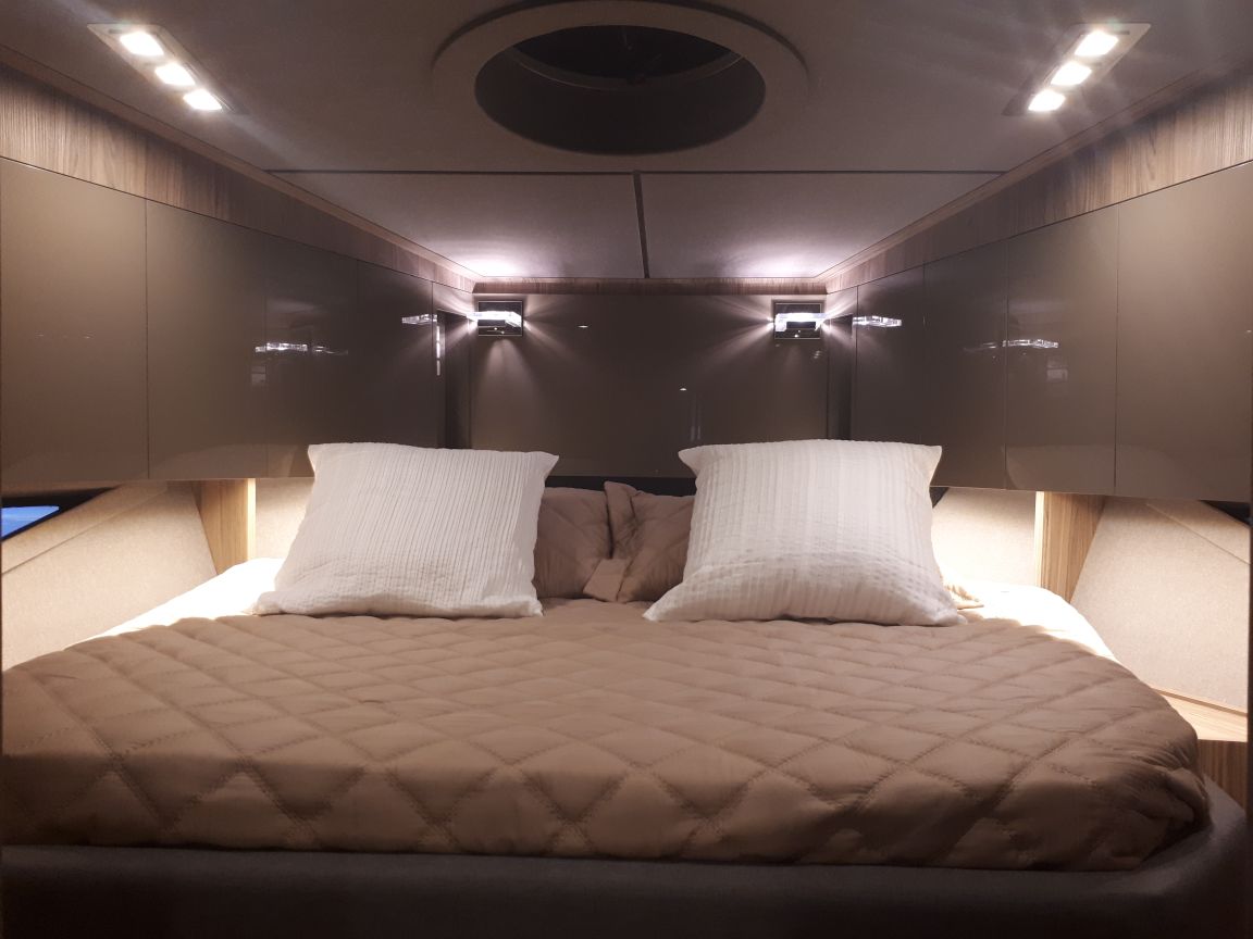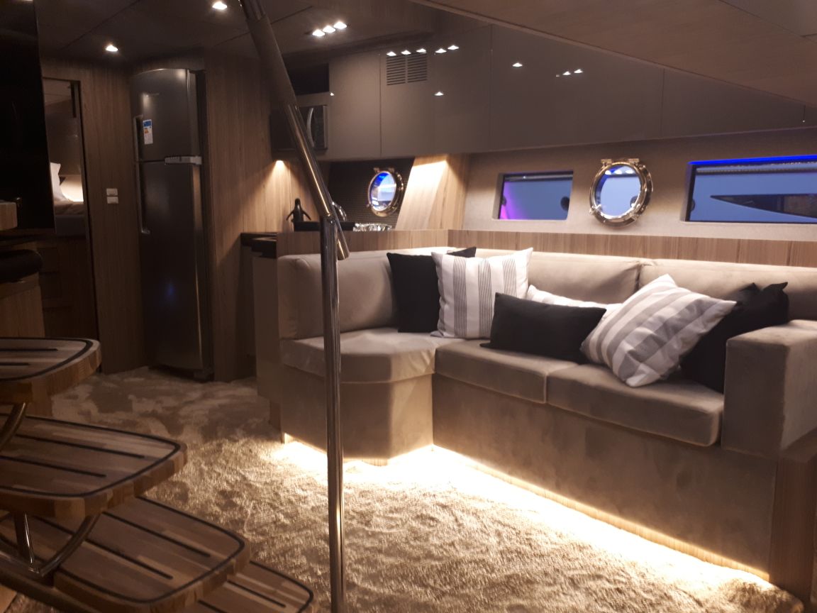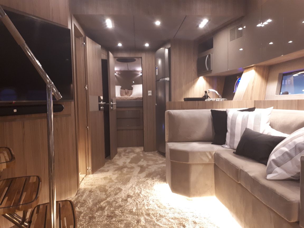Mesa para refeições com sofá e geladeira são características da praça de popa. No pavimento inferior, possui dois camarotes e acomoda confortavelmente quatro pessoas para pernoite. Outro destaque do modelo é o pé-direito dos camarotes e dos banheiros que varia entre 1,9m a 2m de altura. Já a cozinha possui pé-direito duplo. A lancha pode ser equipada com dois motores D6 330 HP ou IPS 500 HP e custa a partir de R$ 1 600 000.