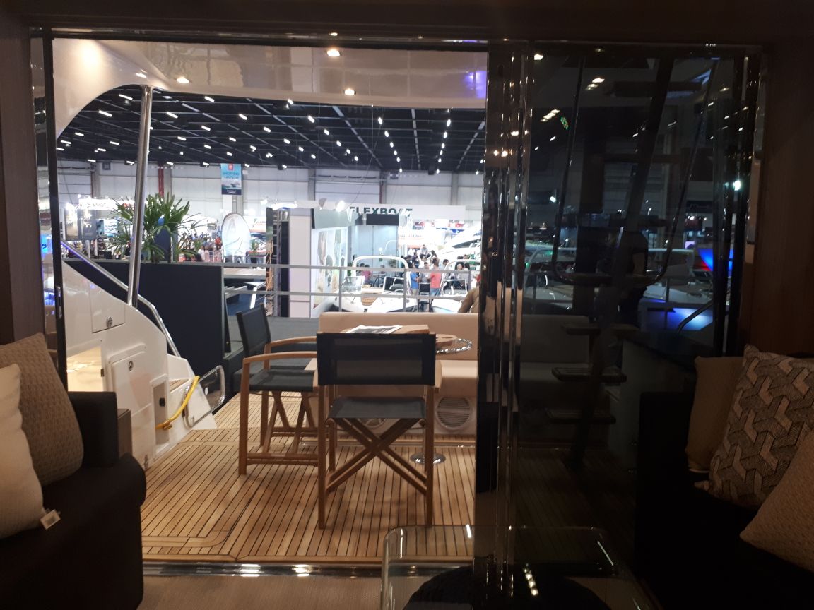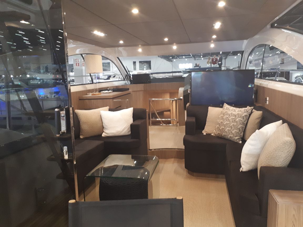 Outro destaque desta, que é a maior embarcação apresentada no salão náutico paulista, é o flybridge com cerca de 40m² de área. O uso do carbono possibilitou ainda o aumento considerável das superfícies de vidro, que praticamente contornam o pavimento principal, do chão ao teto, além de grandes janelas de vidro no pavimento inferior, especialmente, na cabine do proprietário.