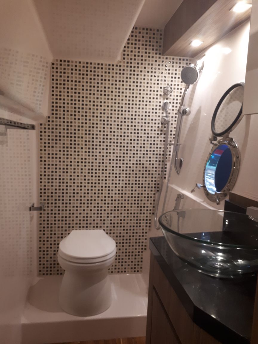 Conta com cozinha completa, com micro-ondas, frigobar, cooktop e ar-condicionado, além de móveis planejados e espaço gourmet com churrasqueira embutida. O barco vem, ainda, com banheiro fechado com box, generosa plataforma de popa com espaço gourmet integrado e hardtop que protege todo o cockpit (inclusive quem está mais à popa), contando também com teto solar com 1,50 metros de abertura.