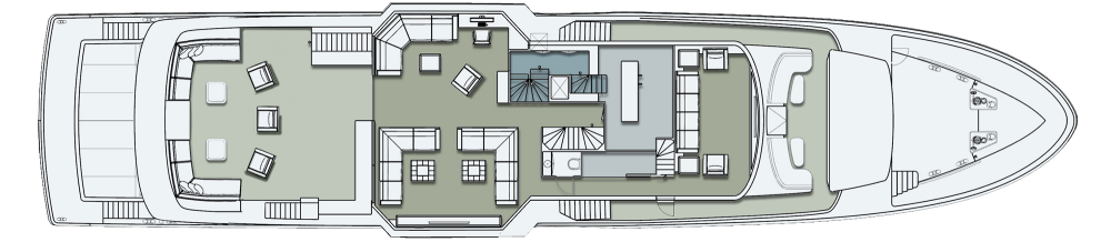 São 30 metros de comprimento, três pavimentos e mais de 300 m² de área no total. Apenas o pavimento superior (flybridge) possui uma área de mais de 65 m², incluindo jacuzzi para 8 pessoas, amplo espaço de relaxamento e de refeições, e segundo posto de comando. O ambiente, estilo lounge, da proa também impressiona assim como as áreas internas, que conta com 5 suítes, grande salão principal com sala de estar, jantar e cozinha equipados, além de posto central de comando com poltronas ergonômicas em couro italiano.