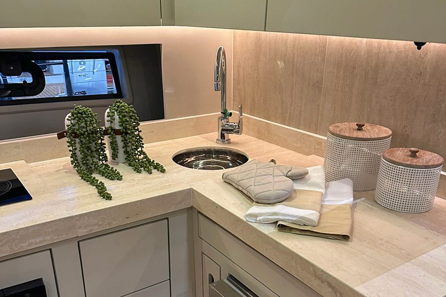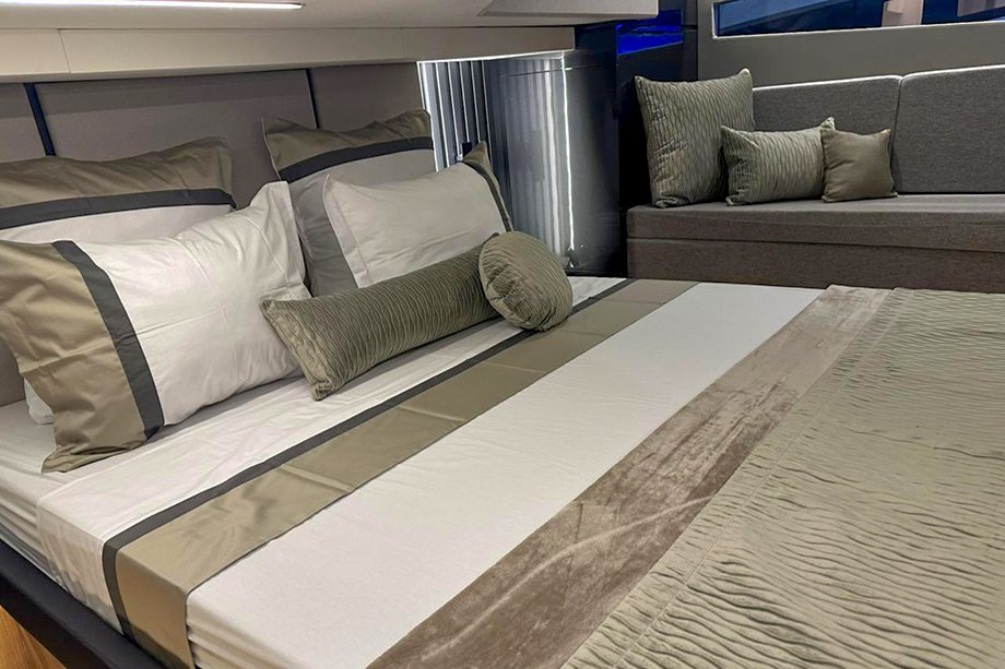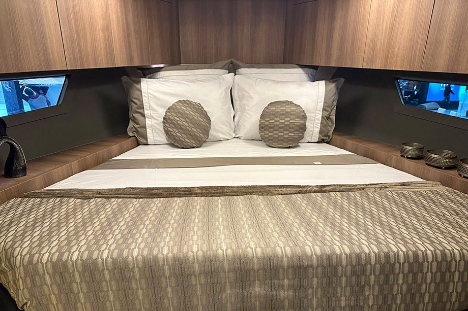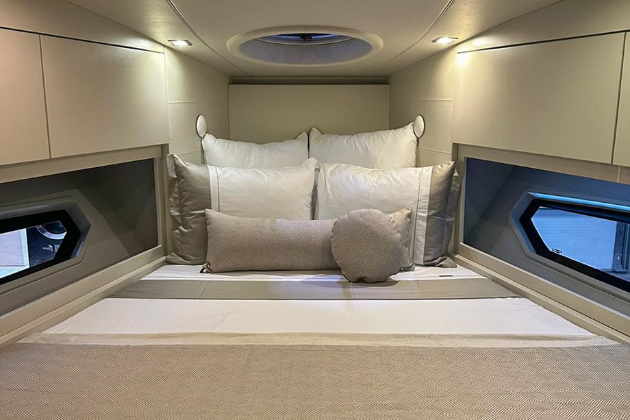 A proa tem uma verdadeira sala de estar com dois sofás, mesa e solário para quatro pessoas — o que a torna uma área perfeita para socializar aproveitando os dias de sol. Na parte interna, a suíte master ocupa todos os 4,05 metros de boca, oferecendo espaço digno de uma lancha de 60 pés.