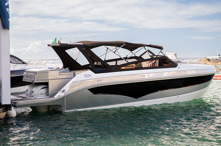 Com um design esportivo, a Real 35 Cabriolet combina os elementos característicos do estaleiro quando o assunto é navegabilidade. Segundo a marca, essa lancha oferece um dos maiores espaços internos da categoria e inclui acesso com degraus amplos que tornam a visita à proa e ao solário mais facilmente.