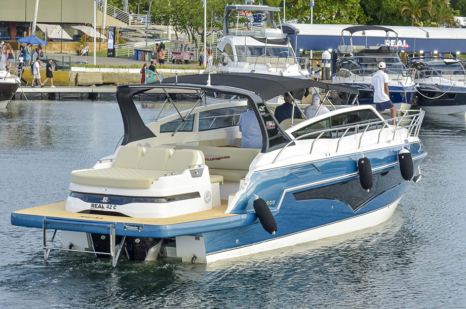 Acrescentar motor de popa num barco habituado a centro-rabeta geralmente poderia fazer a embarcação perder espaço útil na traseira — mas não é o caso na Real 42 Cabriolet. Lançado este ano no Rio Boat Show, o modelo apresenta uma motorização de popa embutida no special deck, para não roubar o espaço de convivência nesta área.