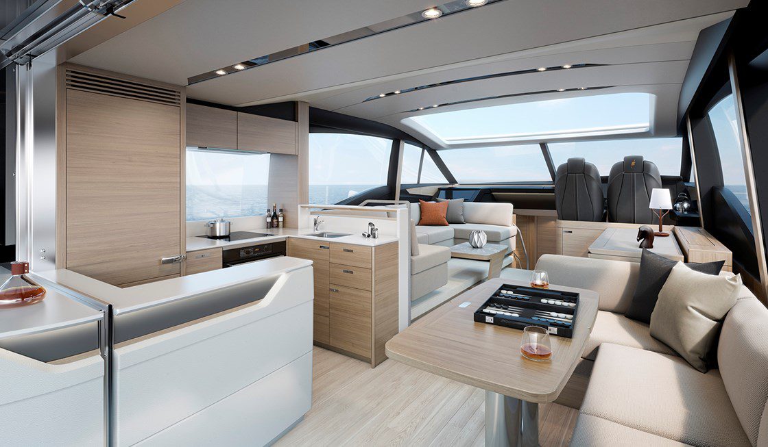 Suas amplas áreas de convés oferecem espaços relaxantes, incluindo área de estar e solário, além de garagem à ré para um bote ou jet. O convés principal conta com cozinha, área aberta para refeições e portas deslizantes com abertura total para o cockpit. Seu layout inclui acomodações para seis pessoas, na suíte máster à meia-nau, além de um camarote vip na proa e outro camarote duplo a boreste, que compartilham o mesmo banheiro. Há, ainda, a opção de cabine para a tripulação à ré.