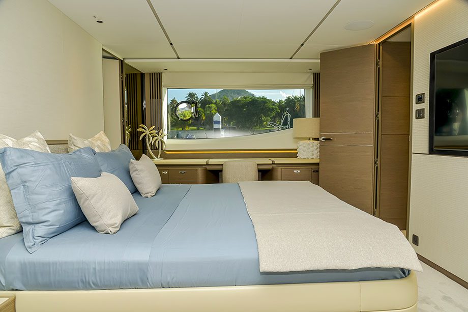O layout contempla dois decks principais e um flybridge aberto, com design assinado pelo estúdio Zuccon International Project. Ao todo, a embarcação acomoda até oito convidados em quatro cabines, além de quatro tripulantes.