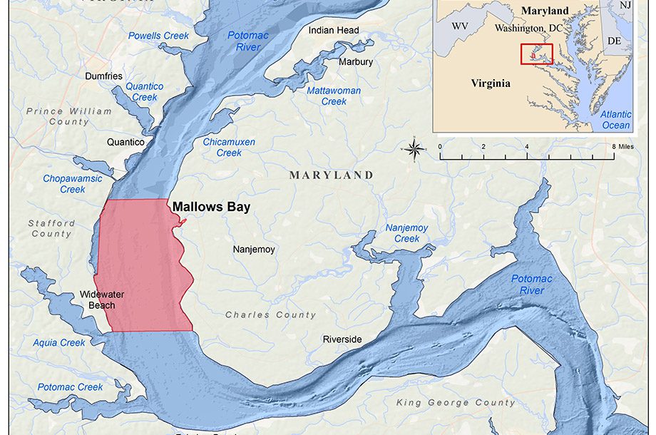 Batizado de Santuário Marinho Nacional Mallows Bay – Rio Potomac, a região abriga hoje um dos ecossistemas artificiais mais ricos do Atlântico, onde a vida selvagem prospera entre destroços de embarcações calculadamente incendiadas que, à época, provocaram um cenário de destruição.