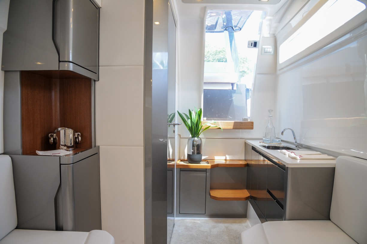A V33 conta com interior revestido, sofá e cama para duas pessoas e banheiro completo. O detalhe mais chamativo, no entanto, é a proa reta: tendência no mercado norte-americano crescente a cada ano.O preço? A partir de R$1 200 000.