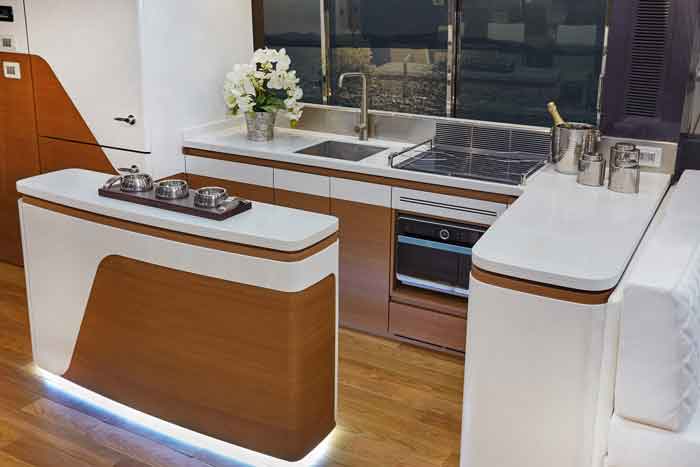 Com 23,56 metros de comprimento (pouco mais de 77 pés), esta é uma lancha para quem procura inovação e modernidade. Seu grande diferencial são as duas plataformas laterais simétricas que se abrem para ampliar generosamente as áreas de convivência sobre o mar. Mas suas armas de sedução vão muito além dessas varandas — que, aliás, dão a sensação de que o barco é maior ainda do que é.