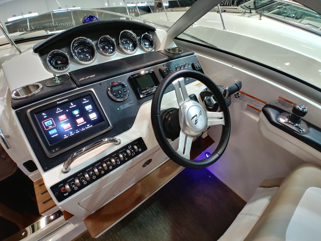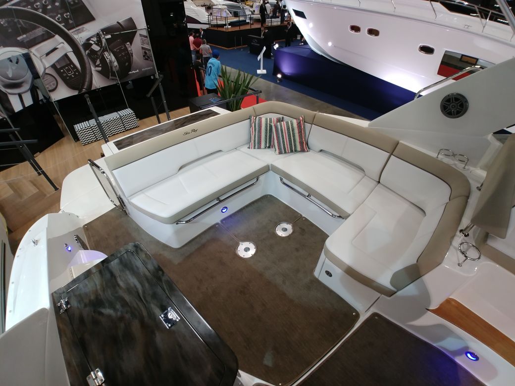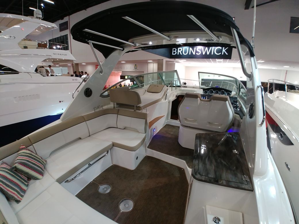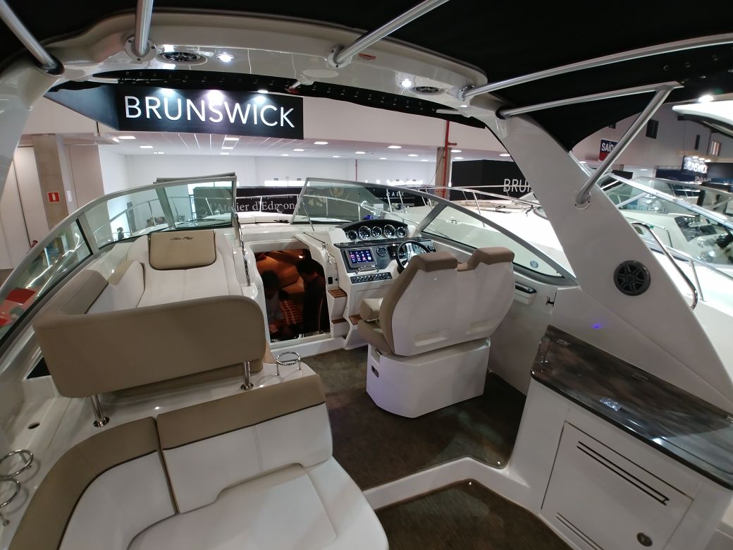 Um dos destaques da americana Brunswick durante o São Paulo Boat Show 2017 está sendo a Sea Ray 375. Nova versão da 350 Sundancer, esta lancha tem no bom acabamento um dos seus pontos fortes. A cabine acomoda bem quatro pessoas em pernoite, sendo um casal na proa e dois adultos à meia-nau, em camas de solteiro que podem ser convertidas em cama de casal. O sofá na sala também vira cama para mais duas pessoas. A área externa é espaçosa, com banco duplo no posto de comando.