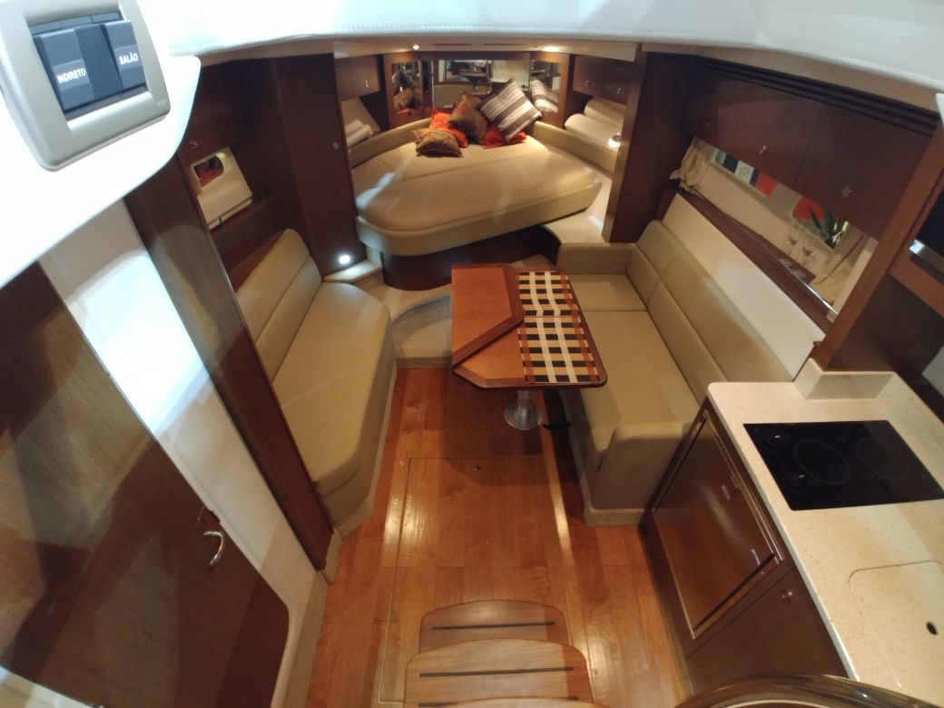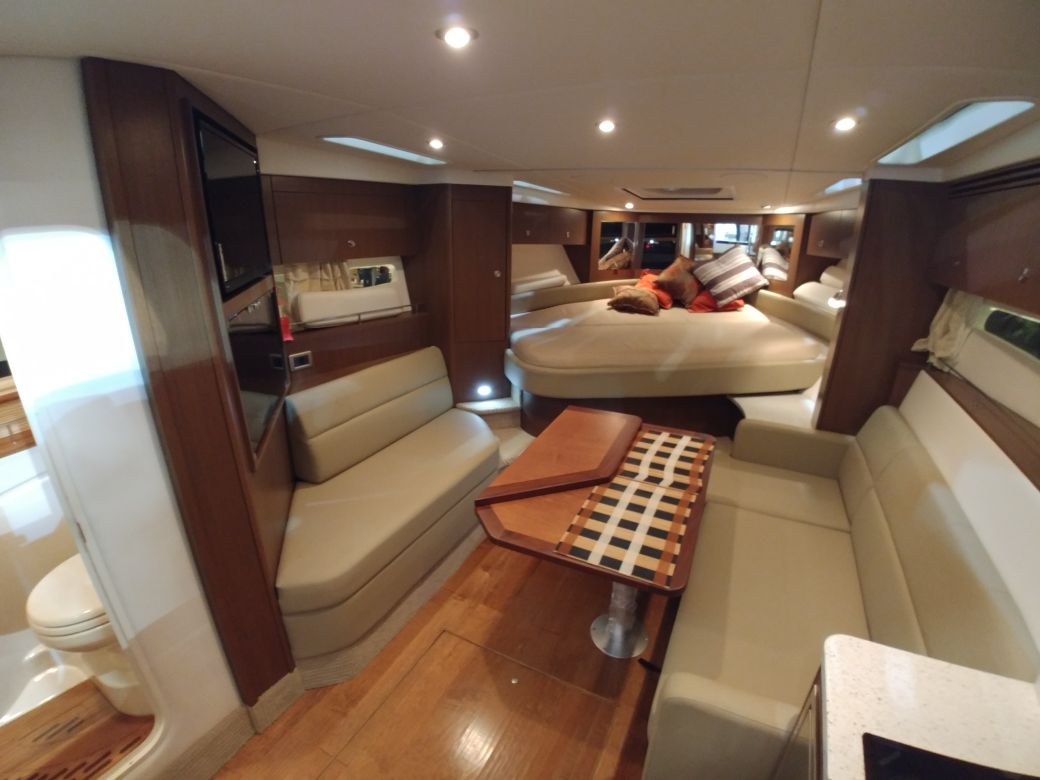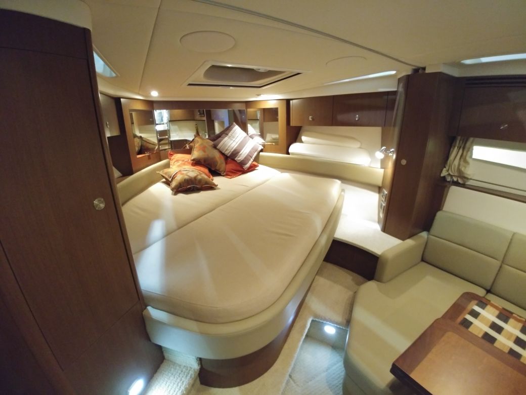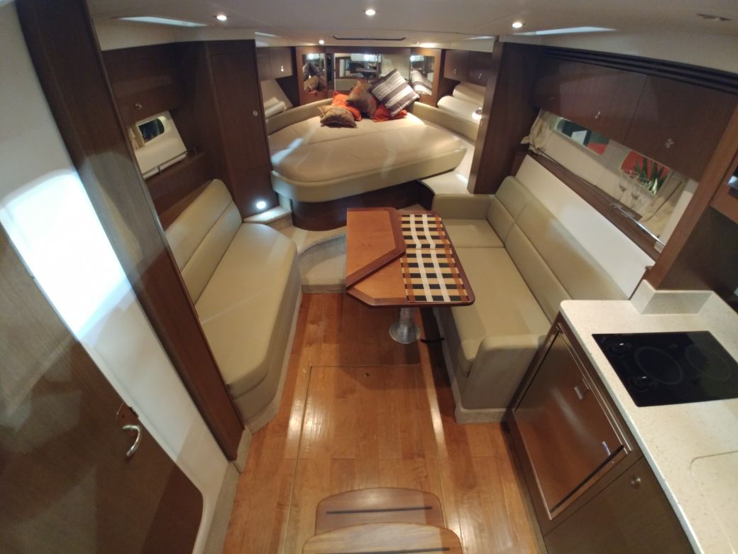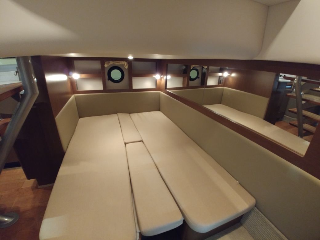 Um dos destaques da americana Brunswick durante o São Paulo Boat Show 2017 está sendo a Sea Ray 375. Nova versão da 350 Sundancer, esta lancha tem no bom acabamento um dos seus pontos fortes. A cabine acomoda bem quatro pessoas em pernoite, sendo um casal na proa e dois adultos à meia-nau, em camas de solteiro que podem ser convertidas em cama de casal. O sofá na sala também vira cama para mais duas pessoas. A área externa é espaçosa, com banco duplo no posto de comando.