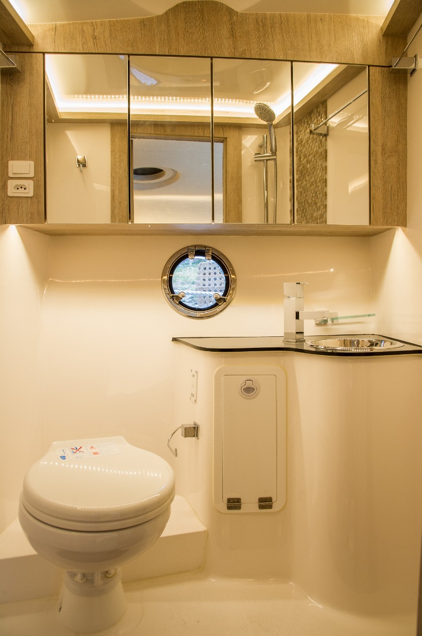 Sua cabine, com 1,85 metro de altura, tem dois camarotes, um na proa e outro à meia-nau, e um banheiro com box fechado. As portas são de vidro e com acabamento em inox, proporcionando conforto térmico e acústico.