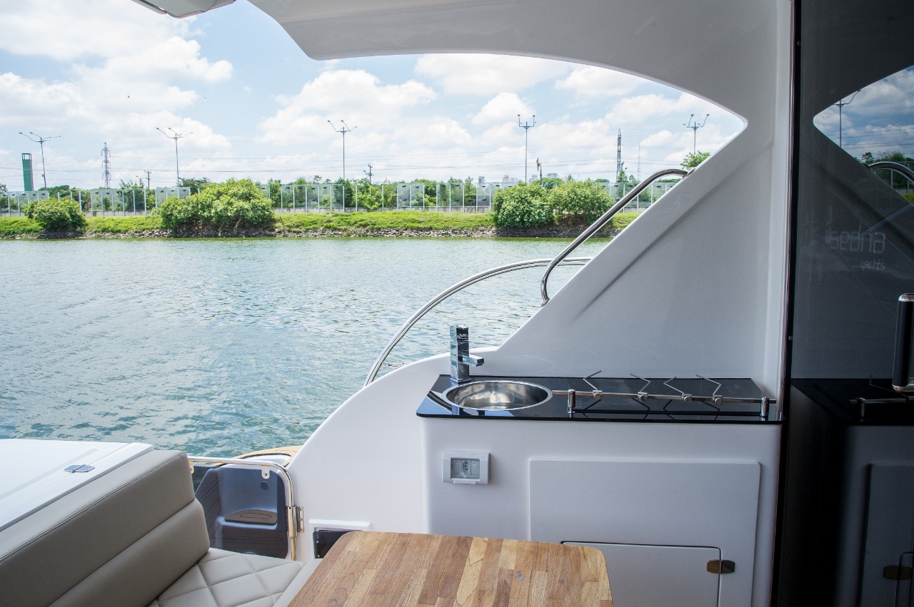 Como um típica hard-top, a lancha tem cockpit integrado ao salão e teto solar, que transforma todo o convés numa espécie de terraço. A passagem lateral para a proa, onde há um ótimo solário, é protegida por uma guarda-mancebo de boa altura. Já na popa, o espaço gourmet tem tábua Metacril e pia como itens de série e fica integrado à uma plataforma de popa com nada menos que 3,10m x 1,50m.