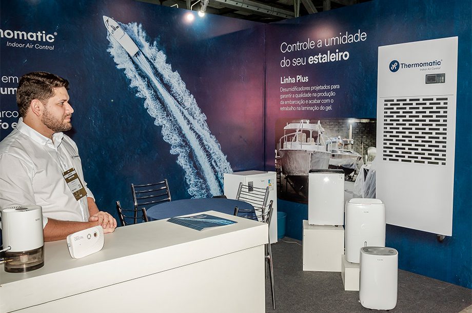 Fabricante de desumidificadores de ar, a Thermomatic está no salão com produtos que retiram até 20 litros de água. O destaque da empresa é o Plus 150, modelo compacto que retira até 12 litros, bivolt (110V e 220V) e que se acomoda em embarcações grandes e pequenas, de acordo com a marca.