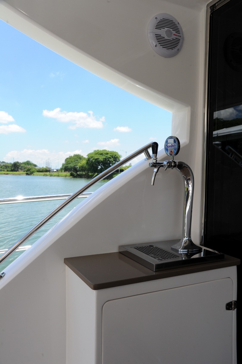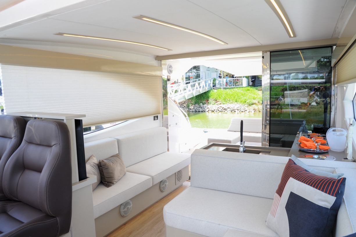 O barco traz uma cabine de marinheiro com pé-direito duplo, Por sua vez, o posto de pilotagem é suspenso, com comando extra de pilotagem pelo Dock Station, para atracação na popa comandado por meio de um joystick.