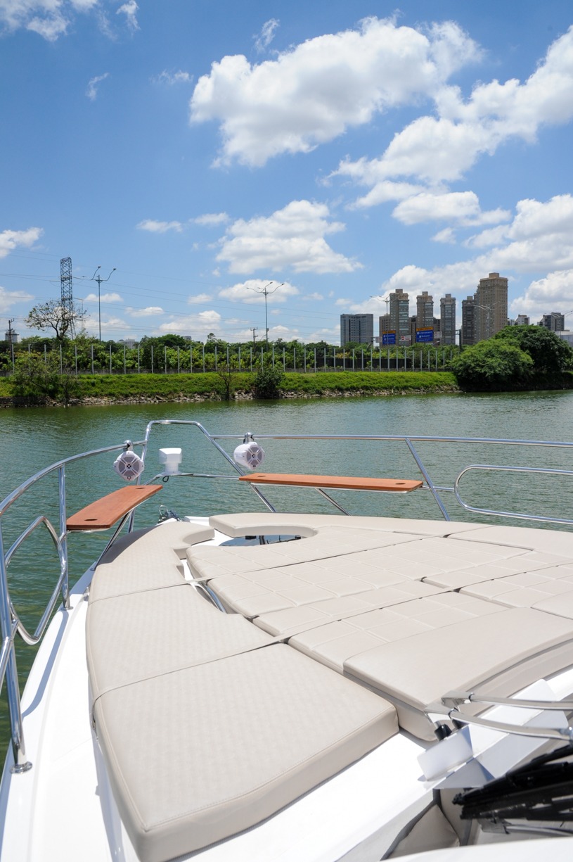 O maior barco do São Paulo Boat Show 2020 tem capacidade para 15 passageiros, além do piloto, e ainda conta com um acesso confortável à proa do barco, ampla para banhos de sol.