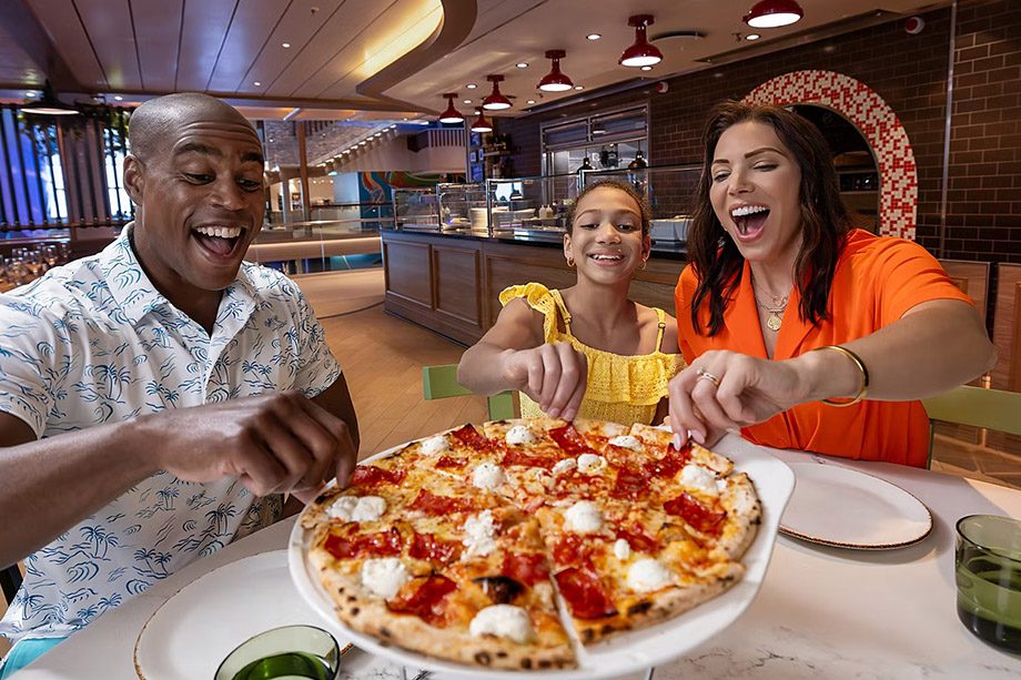 Para refeições rápidas, o navio conta com opções como El Loco Fresh (comida mexicana), Sorrento’s (pizzas), Pearl Café (aberto 24h) e Basecamp, que serve petiscos para quem busca algo prático.