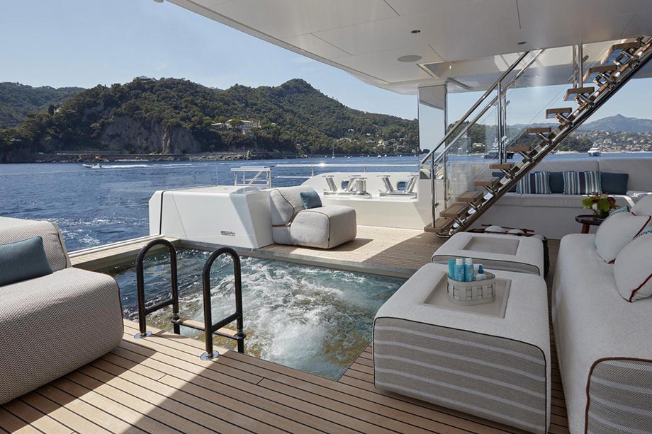 Já nos espaços de convivência o grande destaque é uma piscina de 9 mil litros com vista para a popa do convés. Além de garantir um momento relaxante com seus jatos contracorrentes, ela pode ser elevada até o nível do convés, ampliando o espaço e transformando-o em uma espécie de lounge.