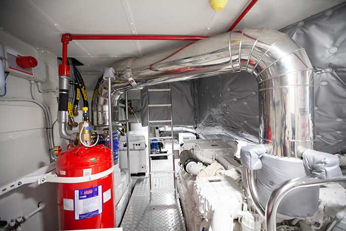 De volta ao modelo avaliado, em outro espaço, a tripulação tem à disposição dois camarotes, sendo um com cama de casal, um banheiro com box, sala com mesa e tv e uma lavanderia. A casa de máquinas, com acesso 360 graus aos dois motores, oferece altura suficiente para uma pessoa de estatura mediana ficar em pé. O modelo avaliado ainda estava equipado com dois geradores de 29 Kw, sistema de estabilização e conversão de energia e dessalinizadores que produzem até 180 litros de água por hora.