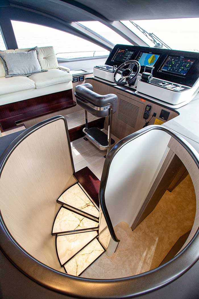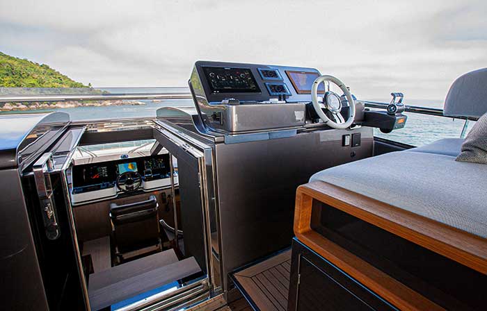 Ao assumir o posto de comando interno, fica a boa impressão de um verdadeiro iate, supercheio de estilo, bem operacional, e com acesso direto ao flybridge (o que é algo excelente) por uma porta de vidro e uma escada. O painel do comando interno tem três telas digitais coloridas. E tudo é muito bonito, confortável e ajustável, como era de se esperar de um barco deste nível. Uma poltrona mais confortável para o comandante deixaria tudo perfeito, e é opcional. No comando superior, a posição é agradável e a visibilidade excelente.