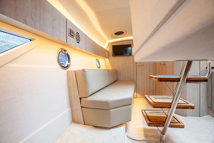 No centro da área de cabine, tem uma sala com sofá e tv (a bombordo), além da cozinha, que fica em um nicho a boreste, com pia, geladeira, micro-ondas e armários. O detalhe é que essa área recebe iluminação natural através do para-brisa (de folha inteira) e do teto solar, montando um pé-direito de 2,33 m. Para refrigerar os ambientes, a lancha oferece aparelho de ar-condicionado de 16.000 btu. O painel elétrico está bem disposto, junto à cozinha, e a fiação, toda estanhada, chama atenção por sua boa qualidade de montagem.