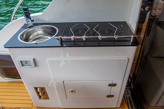 A praça de popa vem equipada com mesa de teca (para três pessoas) com base de mola a gás e bancada com cooktop (item opcional), pia, caixa de gelo, lixeira e cristaleira. A passagem lateral para a proa é um tanto estreita, mas auxiliada por bons pegadores de mão no casario e por um guarda-mancebo de boa altura lançado para fora do casco.