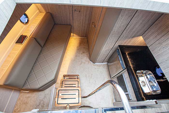 No posto de comando, o banco (duplo e rebatível, com apoio de braços) é de couro, o volante, escamoteável, e o painel tem espaço para um eletrônico com tela de 12 polegadas e até algo mais. A bombordo, há um gostoso divã lateral (aqui o leito para o sétimo passageiro em pernoite).