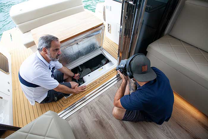 A plataforma submersível de popa, medindo 3,04 m de largura por 1,39 m, é outro ponto forte desta 36 pés. Segundo o estaleiro, sustenta até 400 kg (com a opção de um suporte removível para jet) e vem equipada com ducha e escada retrátil.